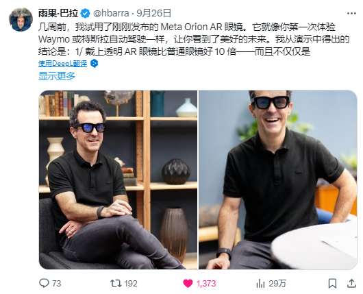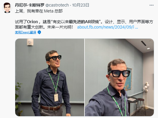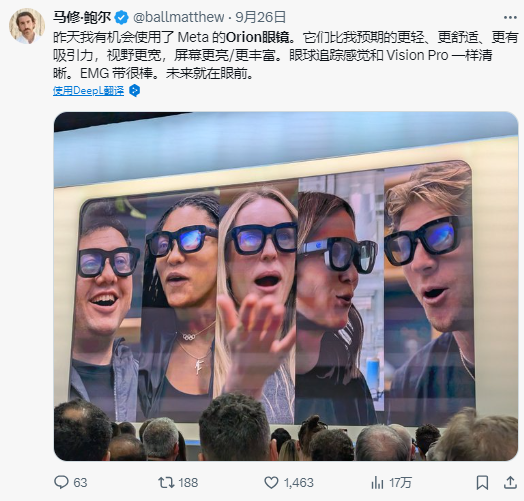 而對于行業(yè)從業(yè)者來說,這個消息更是讓人為之振奮,VR陀螺曾與多位Meta平臺的VR內(nèi)容開發(fā)者交流,大家都表示對于Orion的出現(xiàn)感到非常興奮并抱有強(qiáng)烈的信心,認(rèn)為VR/AR融合的一天可能更早到來,而自己也愿意成為第一批Orion的內(nèi)容開發(fā)者。此外,眾多科技圈大佬也對這款產(chǎn)品給出了極高的評價。英偉達(dá)創(chuàng)始人黃仁勛表示(眼鏡)顯示很棒、追蹤很棒、色彩也很不錯;前小米全球副總裁Hugo Barra認(rèn)為Orion就像第一次體驗Waymo或特斯拉自動駕駛一樣,讓你看到美好的未來……