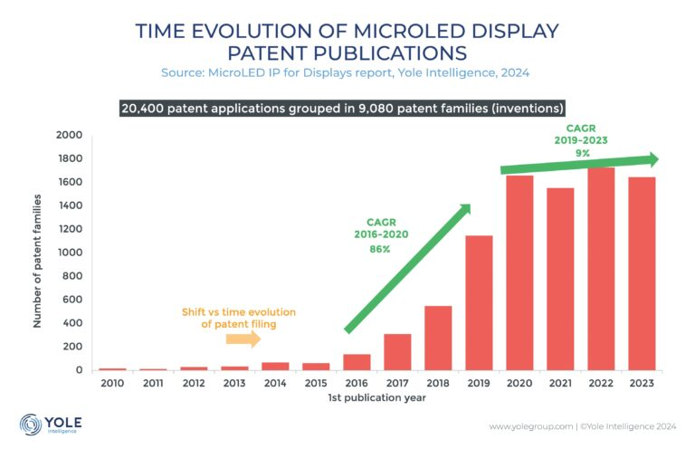 得益于Micro-LED各項性能指標(biāo)的優(yōu)越性,近年來很多科技巨頭以及初創(chuàng)公司都開始關(guān)注這一條賽道,如蘋果早在2014年便已收購了Micro-LED廠商Luxvue,而Meta、Snap、三星、LG等均有豐富的專利技術(shù)儲備。Yole Group數(shù)據(jù)指出,近些年全球Micro-LED專利發(fā)布數(shù)量呈指數(shù)增長趨勢,2021-2023這幾年間新專利超過了11000項。